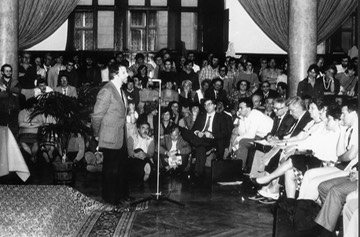 1985 tavasza - Budapest V. kerületi országgyűlési képviselő-választási jelölőgyűlés a Váci utcai "Tisztiházban". Rajk László, a demokratikus ellenzék jelöltjeként elindul független képviselőnek, de jelöltté válását megakadályozzák. (fotó: Taksás Mihály, Novák Zsuzsy)