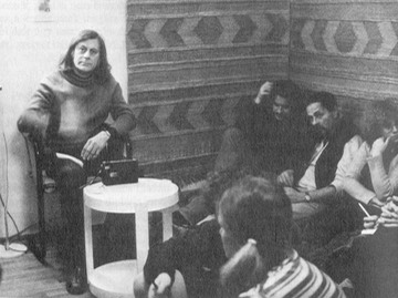 Szabó Miklós előad a Repülőegyetemen. A hallgatóság tagjai között Csalog Zsolt. (1984)
